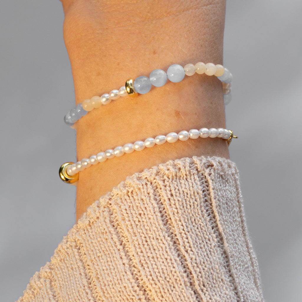 This bracelet is made of freshwater pearls, citrine, and chalcedony elements, and the closure is made of recycled silver and plated with 18k thick gold. A high-quality and strong alloy is particularly important to us for all of our gold-plated products. Suitable for allergy sufferers.