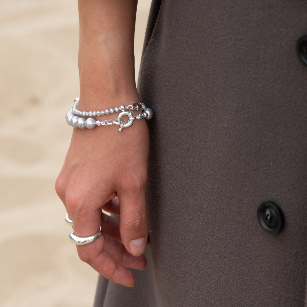 This bracelet is crafted from striking silver pearls and features a recycled sterling silver thick 18k gold-plated closure. We prioritize high-quality, durable silver alloys for all our gold-plated products, ensuring they are suitable for allergy sufferers.