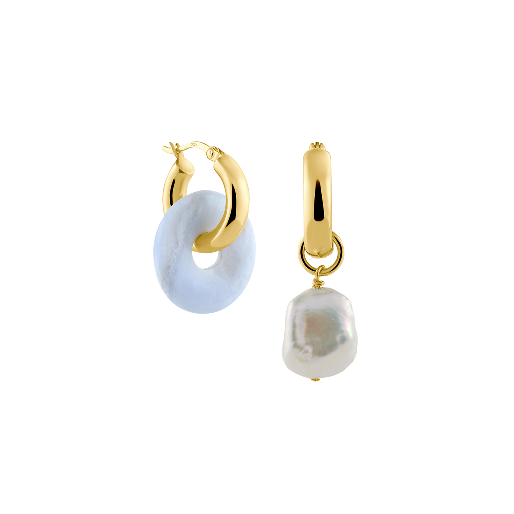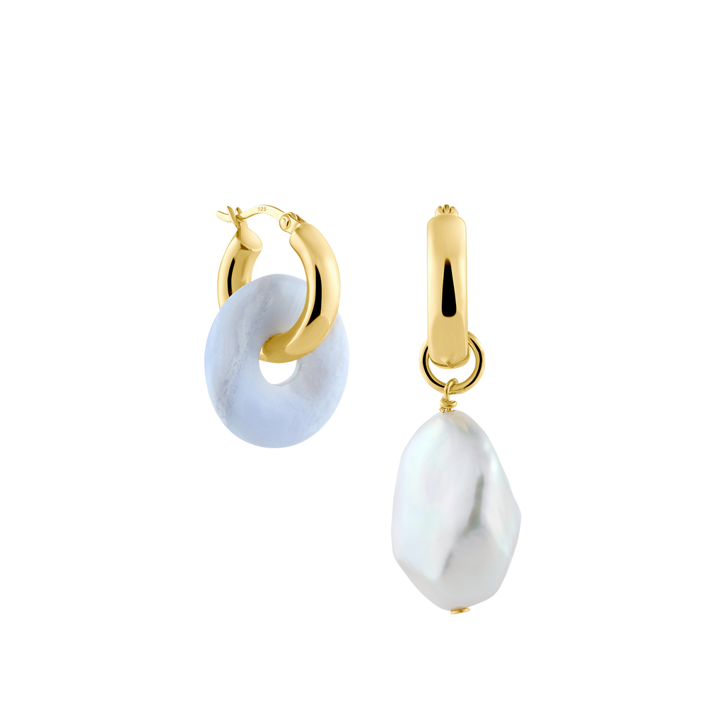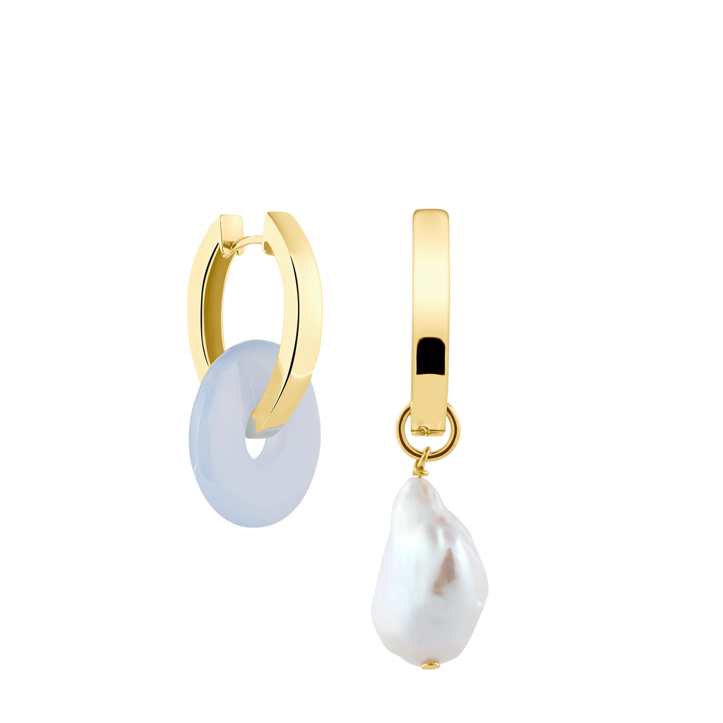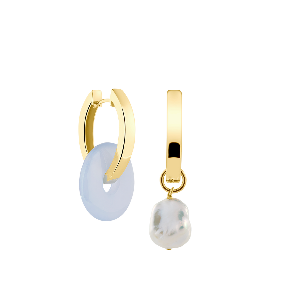 Die Kreolen + Medium Chalcedon sind das perfekte Schmuckstück um mit deiner Mix & Match Kollektion zu starten. Wähle als erstes zwischen unseren Oval oder Big Kreolen. Diese schlichte Kreolen können auch ohne Anhänger getragen werden. Als nächstes wählst du dein Anhänger Paar aus. Hast du Lust auf Farbe? Nehme ein Doppeltes Set von unseren Chalcedon Edelstein Anhänger. Wenn du ein einzigartiges Schmuckstück für deinen Schmuckkasten möchtest, wähle einen unserer Perlenanhänger zu deinen Edelsteinanhängern aus: Unsere Keshi-Perlen sind etwas kleiner, während unsere Barockperlen bauchig und rund sind. Beide asymmetrischen Ohrring-Anhänger Paare sind ein echter Hingucker.
